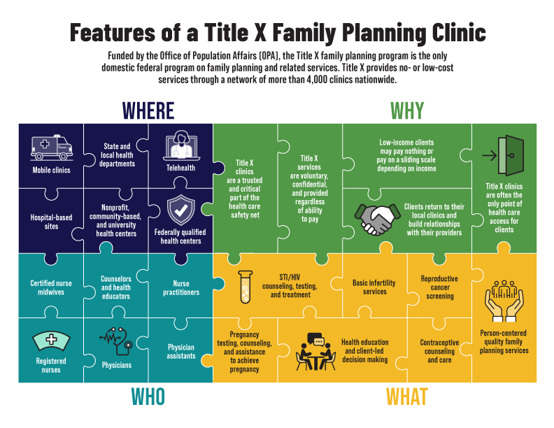 OPA supports a network of Title X grant recipients that provide a wide range of voluntary, client-centered family planning and related preventive services across the country. The Title X family planning program is a critical part of America’s public health safety net, serving as a point-of-entry into care for millions over the program’s more than 50-year history. Learn more about Title X and find a family planning clinic near you.
